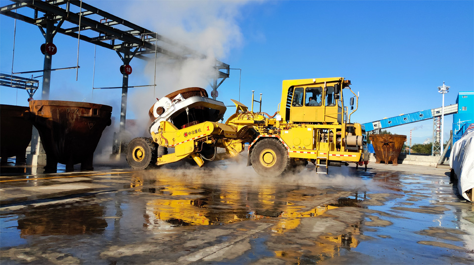 由中冶寶鋼研制的70噸鉸接式抱罐車,采用鵝頸鉸接型式,額定載重75噸,重載最高時速為每小時20公里,翻罐角度105度,最大爬坡能力8%,最小轉彎半徑9米。該車型應用專利技術10項,在國內有色冶煉市場占有率超過75%,先后榮獲中國有色工業(yè)協(xié)會、中國鋼鐵工業(yè)協(xié)會科技獎,中國施工企業(yè)管理和中國循環(huán)經(jīng)濟協(xié)會專利獎等榮譽。